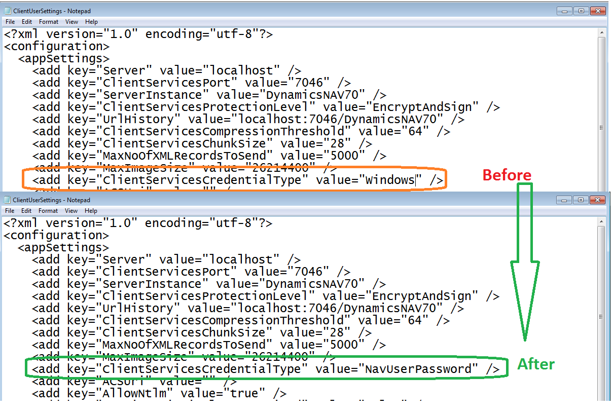 When i opened the file, i figured out that ClientServicesCredentialType is still windows. Lets try to change it to NavUserPassword.